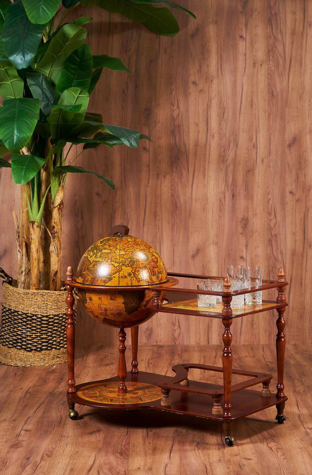 1952 Yılına ait antika servis arabalı bar, tamamen ahşap malzemeden oluşmaktadır. Dünya kısmı açılıp kapanabilir olan antika servis arabalı bar, ön bölümünde iki adet rafa sahiptir. Hem küre kısmı hem de dikdörtgen olan kısmı servis için kullanılabilir. El yapımı olan antika servis arabalı bar, her mekanda kolayca kullanılabilir. Renkli işlemelere sahip olan antika servis arabalı bar, tekerlekli yapısı ile kolay taşınabilir özelliğe sahiptir. Aynı zamanda ev dekorasyonu ya da ofis dekorasyonu için de rahatlıkla kullanabileceğiniz antika servis arabalı bar, tarihi dokusu ile mekana farklı bir hava katacak. Antika hediye severler için de oldukça anlamlı olan antika servis arabalı barı sevdiklerinize hediye edebilirsiniz.