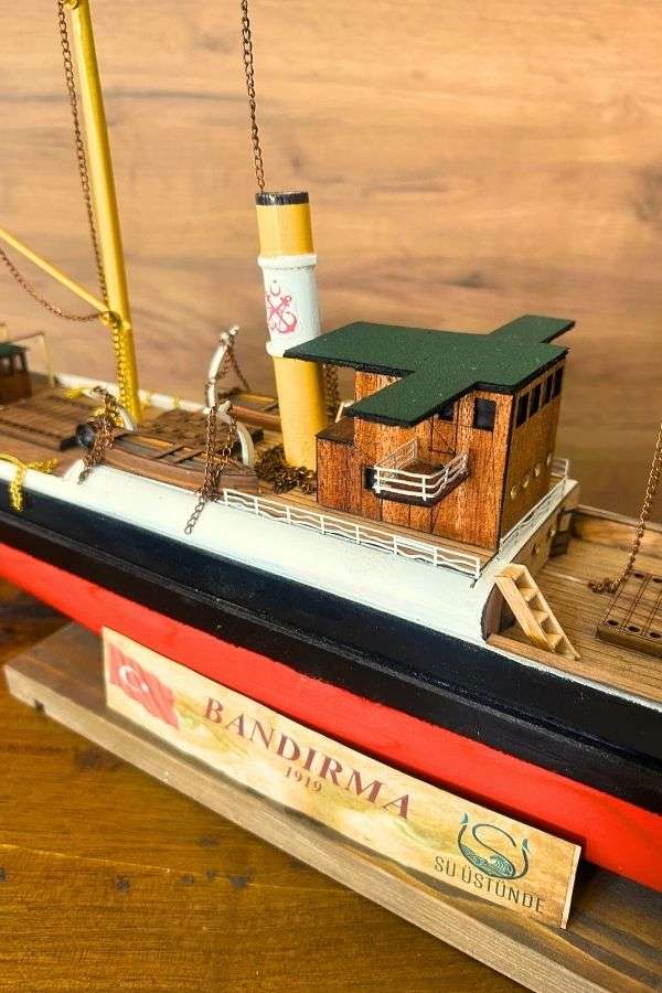 Tamamen ahşap malzemeden üretilen bu maket, sıcak ve doğal görünümüyle bulunduğu ortama karakter katar. Tarihi değeri yüksek bir gemiyi dekoratif bir objeye dönüştüren Bandırma Gemisi Maketi, özellikle ahşap gemi maketi, el yapımı gemi maketi ve koleksiyonluk denizcilik ürünleri arayanlar için dikkat çekici bir seçenektir.