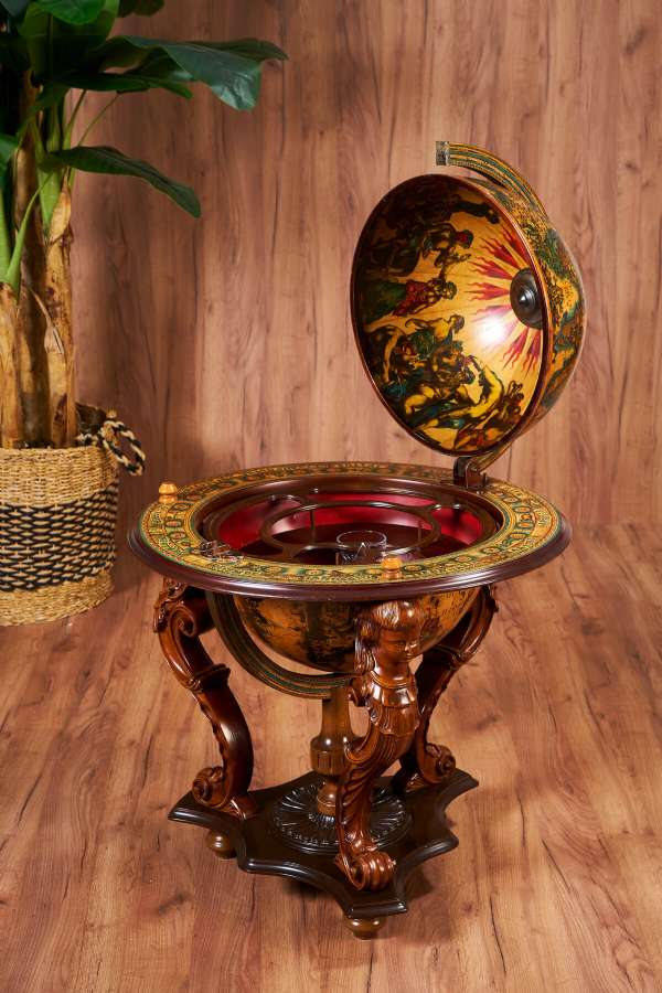 Ahşap malzemeden yapılan dünya küre viski standı, dekorasyonda karakteristik tasarımlar tercih edenler için ideal bir ürün. Ev dekorasyonu ya da ofis dekorasyonu için de rahatlıkla kullanılabilen ahşap küre dünya viski standı, özel tasarımı ile mekana farklı bir hava katacak. Sevdiklerinize de hediye edebileceğiniz ahşap küre dünya viski standı, özel tasarımı ile her konsepte ve dekorasyona uyumludur. Özel sunumlar için oldukça şık ve kullanışlı olan küre dünya viski standı, ahşap ceviz malzemeden yapılmıştır. Üst kısmı açılıp kapanabilen küreden oluşmaktadır. Kapalı haliyle de dekoratif bir ürün olarak rahatça kullanılabilir. Ahşap ayaklara sahip olan küre dünya viski standı, özel işlemelere ve ahşap oymalara sahiptir.