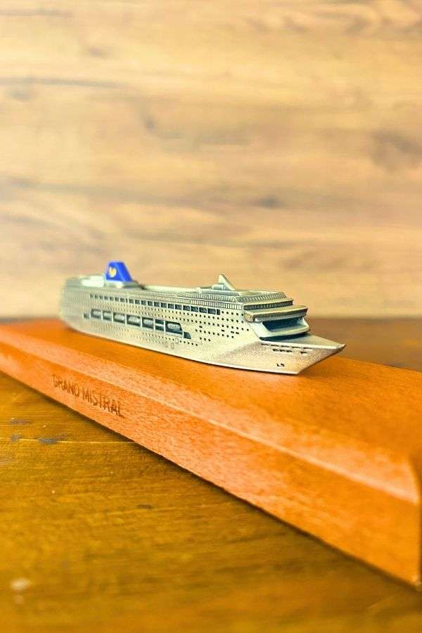 Grand Mistral yolcu gemisinin zarif hatlarını yansıtan bu metal döküm maket, İtalyan yapımı özel bir dekoratif koleksiyon parçasıdır. Gerçek gemi formundan ilham alan detaylı tasarımı, kompakt ölçüleri ve şık duruşuyla denizcilik tutkunları, gemi koleksiyonerleri ve farklı dekoratif objeler arayanlar için dikkat çekici bir seçenektir.