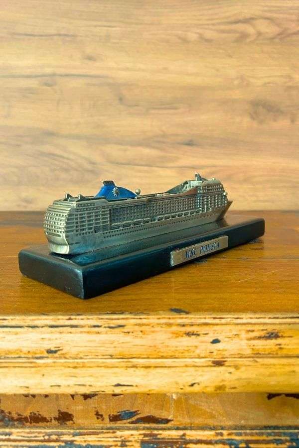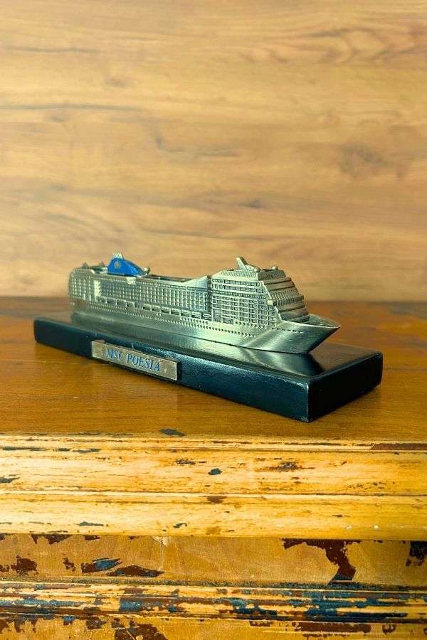Bu ürünün gemi modeli kısmı metal tek parça olarak tasarlanmıştır; sağlam yapısı sayesinde uzun süre formunu korur. Altındaki ahşap kaide, ürüne hem prestijli bir duruş hem de düzenli bir sergileme alanı kazandırır. Üzerindeki “MSC POESIA” isimlik detayı, koleksiyon değerini artıran tamamlayıcı bir unsurdur.