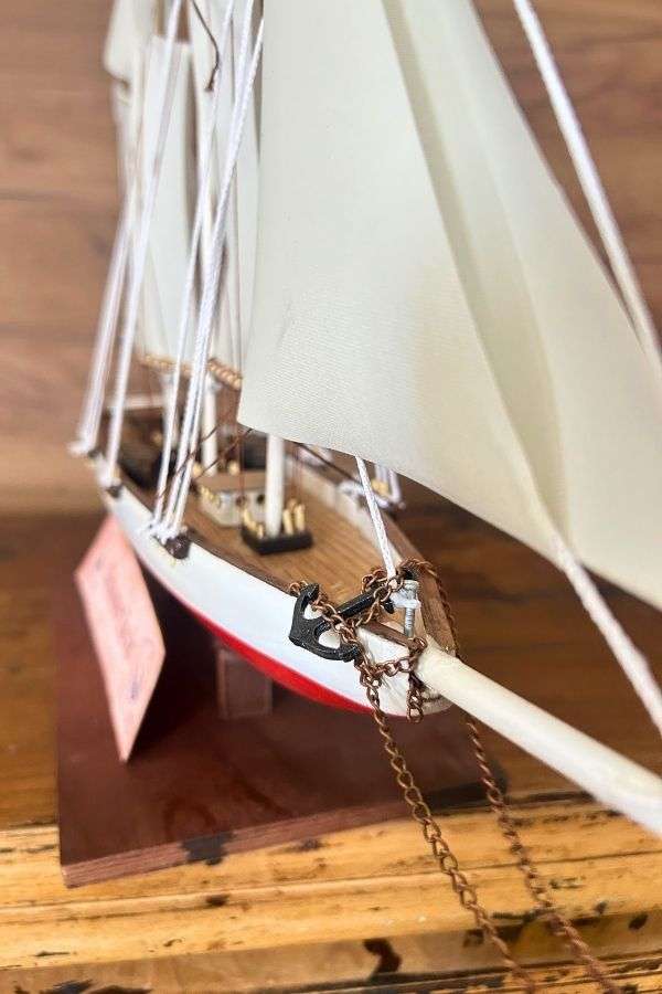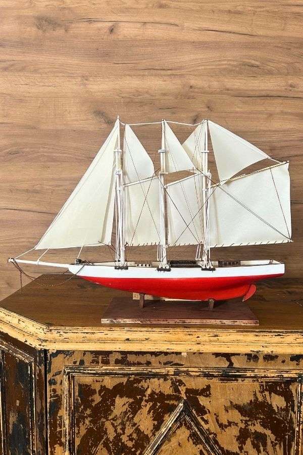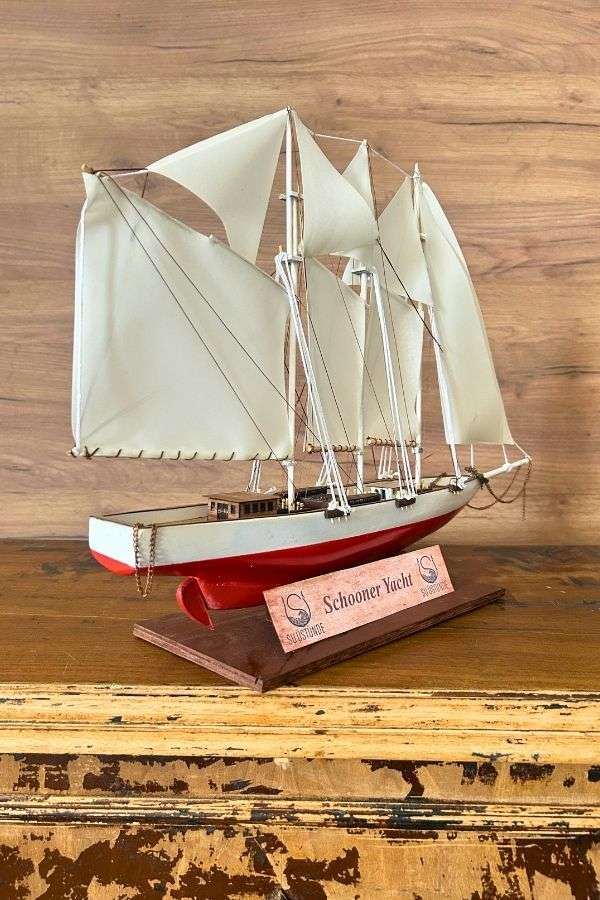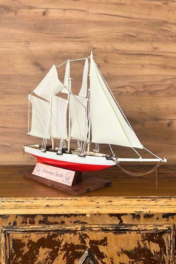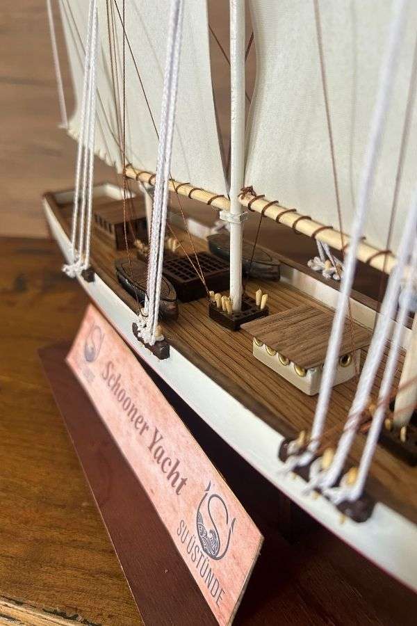 Beyaz gövde üzerine kırmızı alt detaylarıyla öne çıkan Schooner Yacht, çok yelkenli yapısı sayesinde klasik yelkenli teknelerin karakteristik görünümünü başarılı şekilde yansıtır. Ahşap kaidesi üzerinde sergilenmeye uygun olan bu ürün; ev, ofis, vitrin, çalışma odası, tekne konseptli dekorasyon alanları ve koleksiyon köşeleri için ideal bir tamamlayıcıdır.